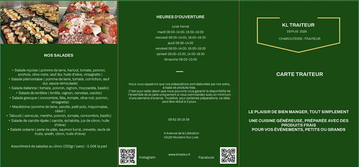 KL Traiteur vous propose une carte variée de plats cuisinés, de spécialités charcutières et de buffets pour tous les goûts. Nos produits sont élaborés artisanalement dans notre laboratoire à Monistrol-sur-Loire.